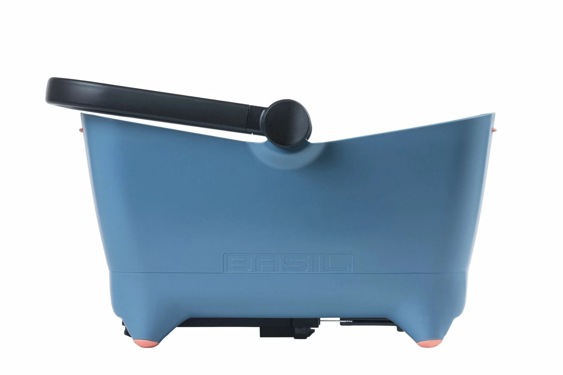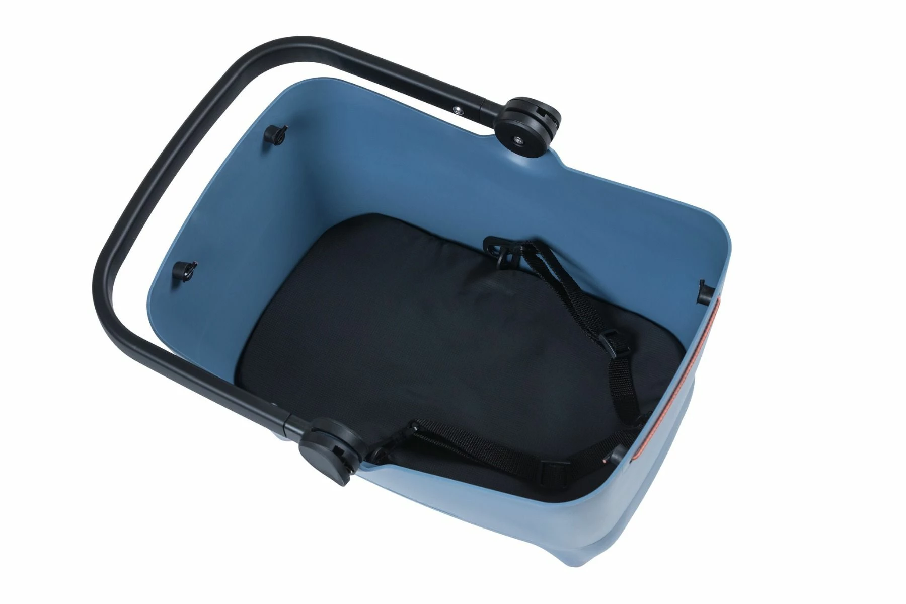 Basil Buddy Dog Bike Basket er lavet af slidstærkt plastik for holdbarhed, mens den falmede denimfinish gør den til et attraktivt valg for kæledyrsejere.