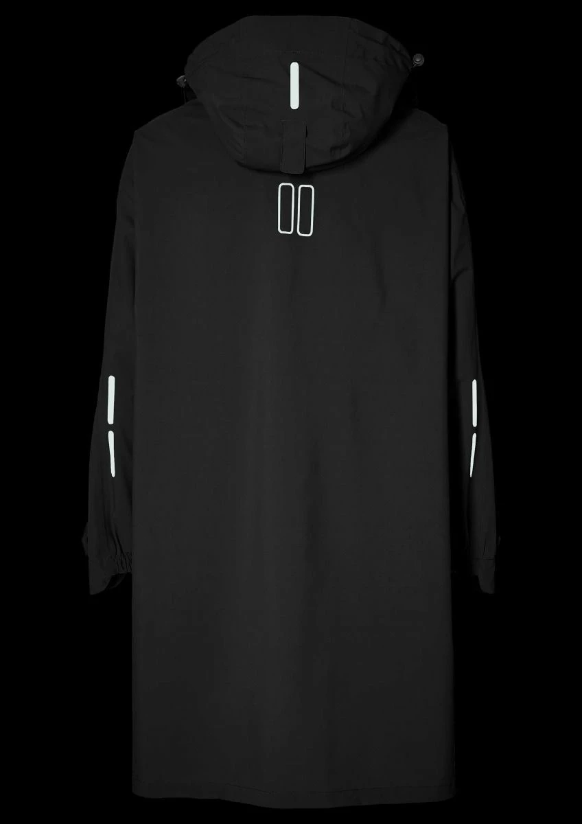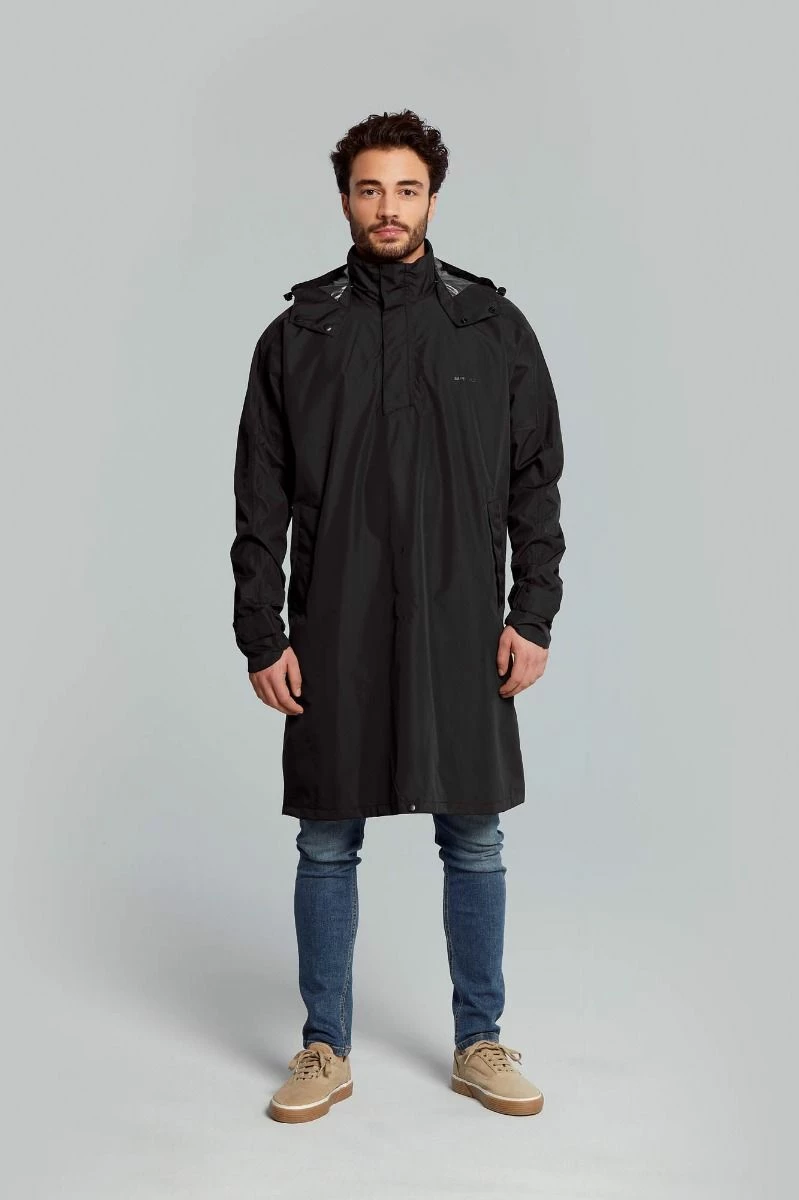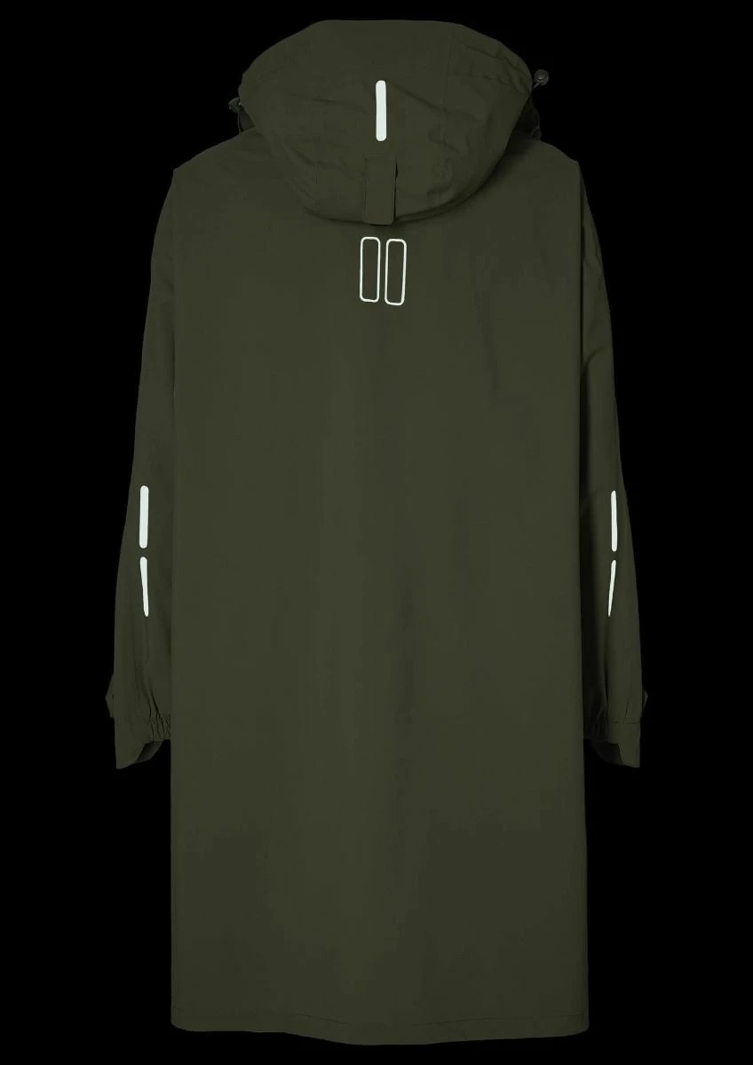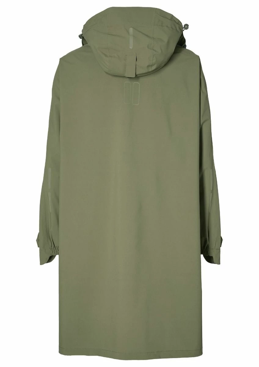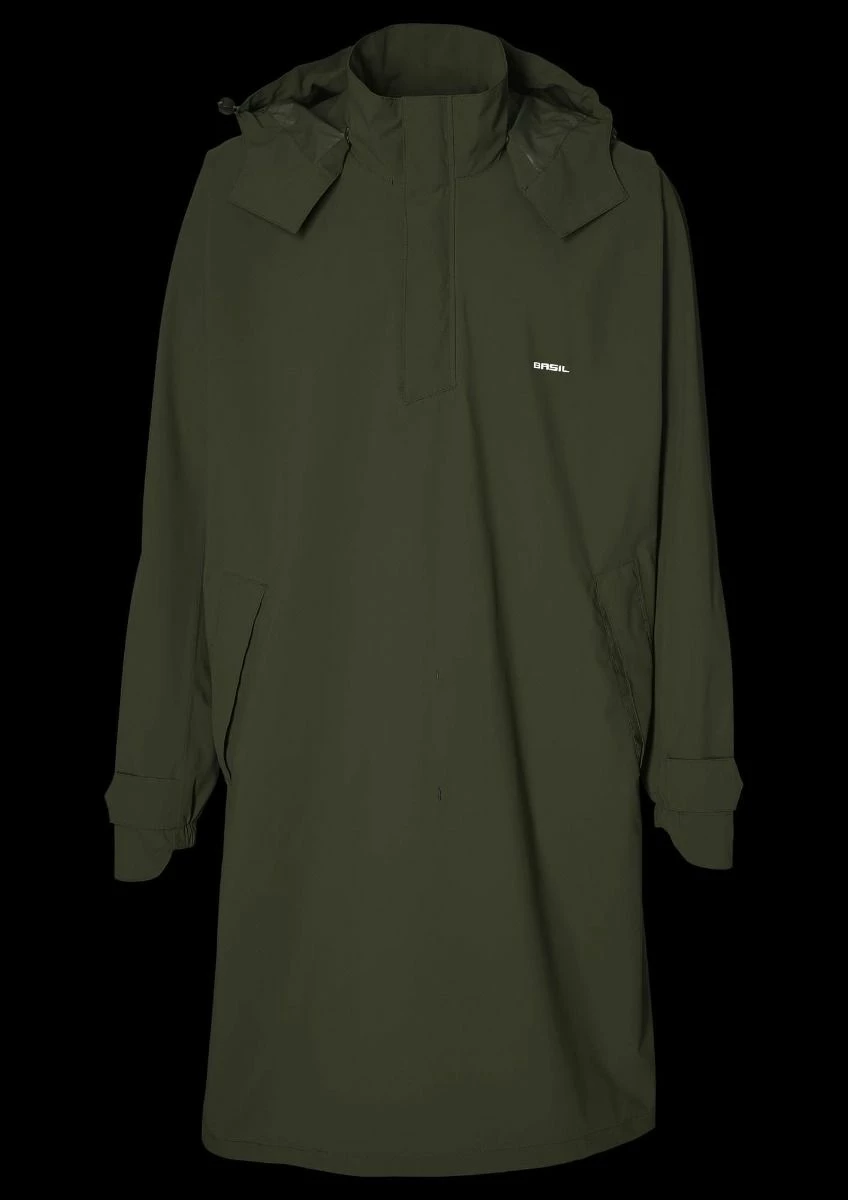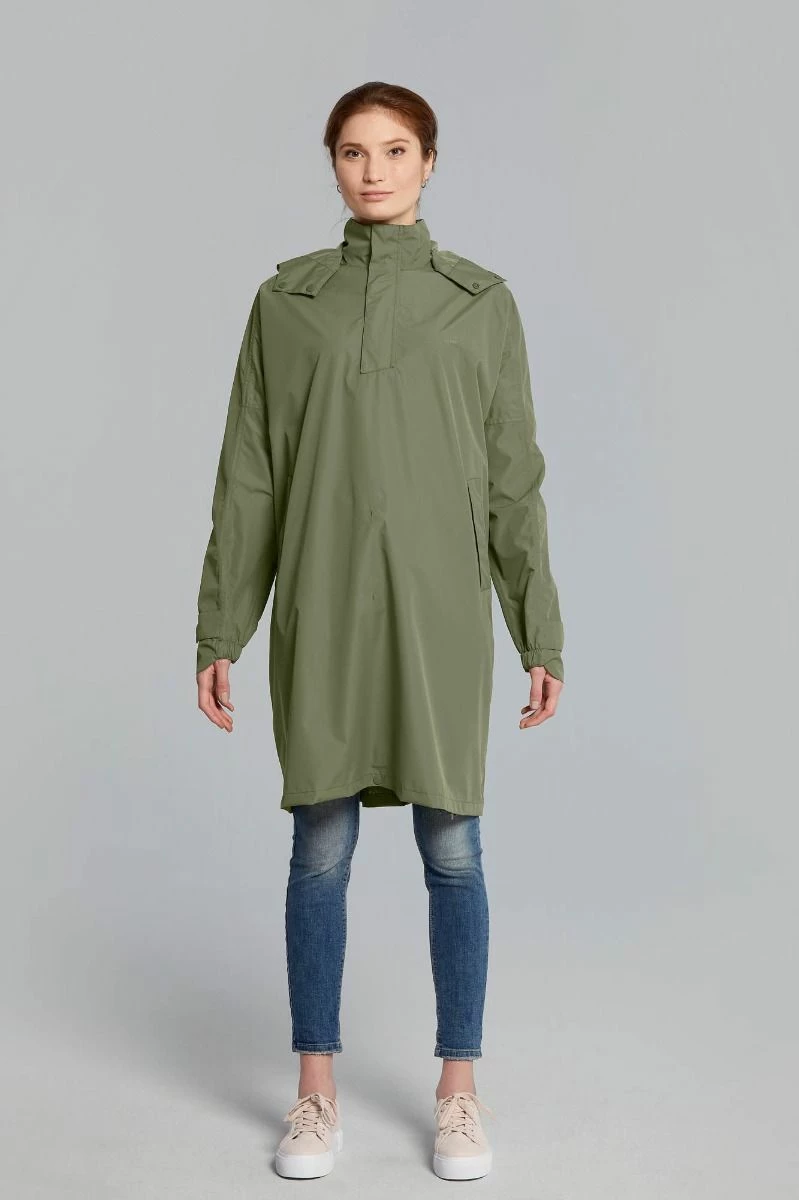 Den rummelige lukning, sidelommer og tone-til-tone reflektion bidrager til komfort, bærekomfort og trafiksikkerhed. Den forreste og bageste del af ponchoen kan tilsluttes med en snapknap. Benene forbliver beskyttet, og det forhindrer, at der sprænges i en stærk vind. En-ponchoen i farve olivengrøn kommer med en pose.