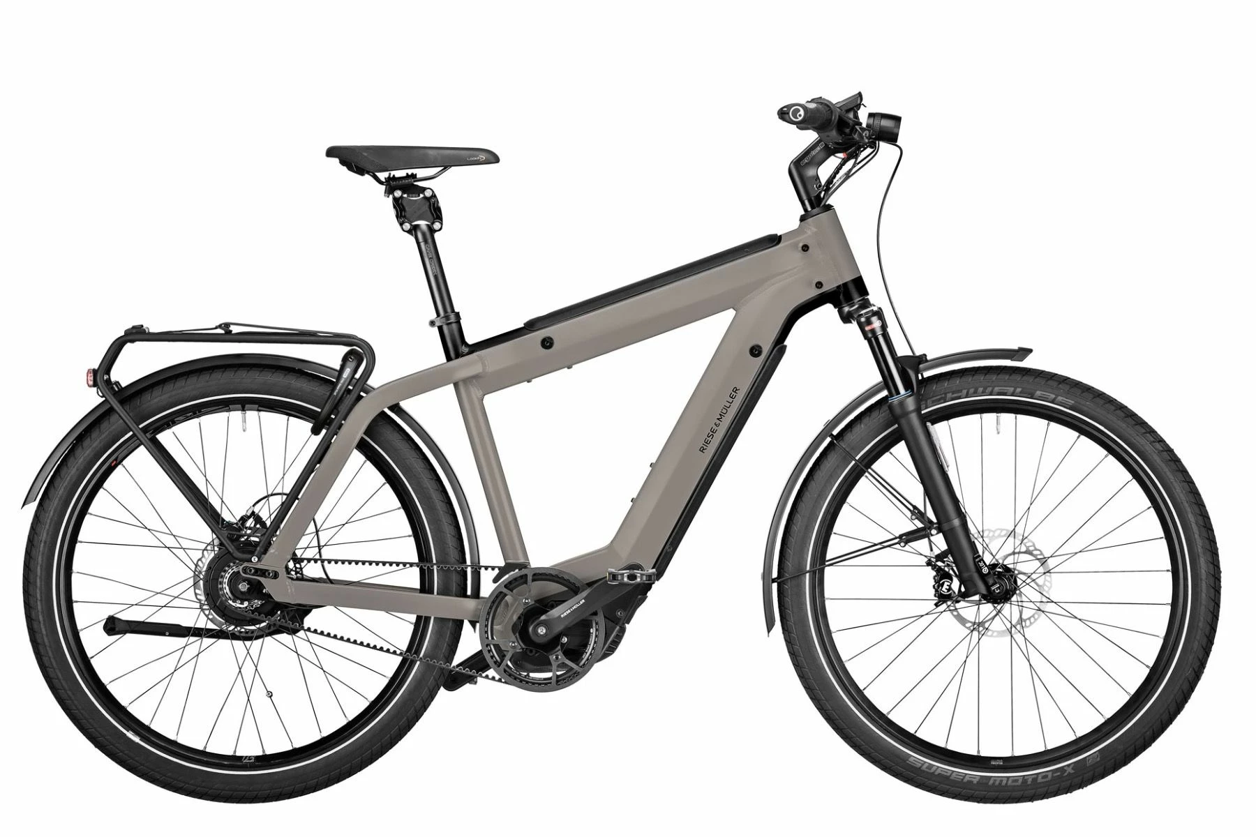 Riese & Müller Supercharger GT Vario er udstyret med en 36 V / 250 Watts Bosch Performance CX (4rd gen.) centermotor og du kan nemt køre op til 180 km på de dobbelte fuld integreret 14 Ah / 500 Wh batterier – samlet har du så 1000 Wh at gøre godt med. Det er særdeles lækker til de rigtig lange ture, Offroad eller hvis du ønsker speed-versionen – Motoren sørger selv for at balancere batteriforbruget jævnt mellem begge batterier, så ingen af dem bliver overbrugte. Bosch Performance CX centermotoren trækker direkte på kranken, og giver dig med rotations- og momentsensorerne en god og komfortabel føling med motorens kraft – suppleret med det trinløse Enviolo / Nuvinci N380 gear, det lækre Gates Carbon Remtræk, Magura MT4 skivebremser og Supernova mini 2 pro forlygte samt Toplight 2C LED baglygte.
