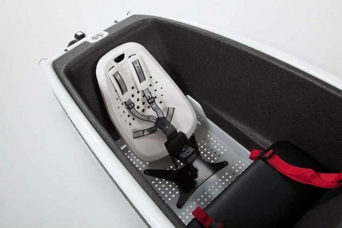 Skal du have din Yepp Mini med? så er Urban Arrow’s Yepp-beslag løsningen – den placeres i bunden af kassen med 4 fastspændingspunkter, og sørger – med sin bagudvendte stilling – for at du hele tiden kan kommunikere med dit barn.